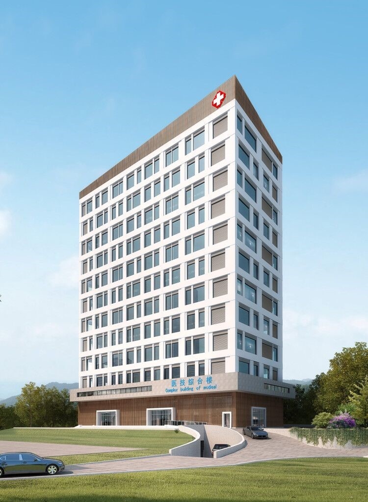 该项目占地面积1045.64㎡,总建筑面积14171.74㎡。项目规划着重于生态环境与高科技医疗建筑形象的研究,将建筑与环境景观紧密融合,充分体现医技“值得信任的高科技”的个性特点。该项目拟建场地为山地地形前后高差较大,消防环道坡度为11%,致使道路陡度高。为解决由此带来的院区推床与病人行走困难问题,使各类综合因素配合度更高,设计团队经过多次现场实地考察和多方案比对研究,最终利用高差劣势转成预留下沉景观广场优势,同时使用双首层设计手法,使背面道路可直接通过建筑内一层与二层之间的电梯空间快速到达。