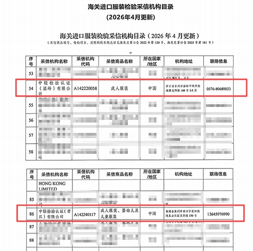 近日,中轻检验认证(晋江)有限公司、中轻检验认证(浙江)有限公司(原名:中轻检验认证〔温岭〕有限公司)均成功入选国家海关总署《海关进口服装检验采信机构目录》。这充分体现国家权威部门对中轻检验技术实力与服务水平的高度认可,彰显其在轻工纺织检测领域专业优势与行业影响力。