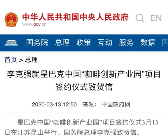 2020年3月13日,星巴克中国“咖啡创新产业园”项目签约仪式在江苏昆山举行。国务院总理李克强致贺信。