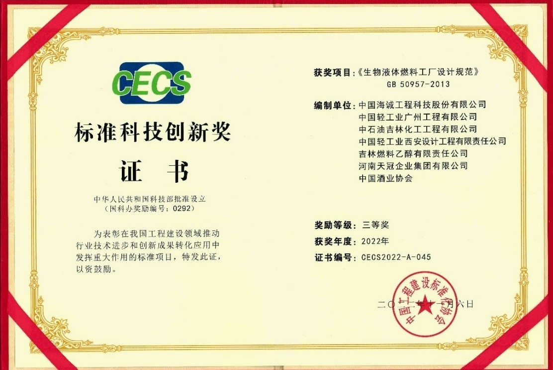 近期,2022年度标准科技创新奖颁奖典礼大会在京隆重举行。经过各方推荐申报、形式审查、专家初评、项目现场答辩、评审委员会投票和最终审定、结果公示等程序,中国海诚主编的《生物液体燃料工厂设计规范》(GB 50957-2013),荣获“标准科技创新奖”项目奖三等奖。