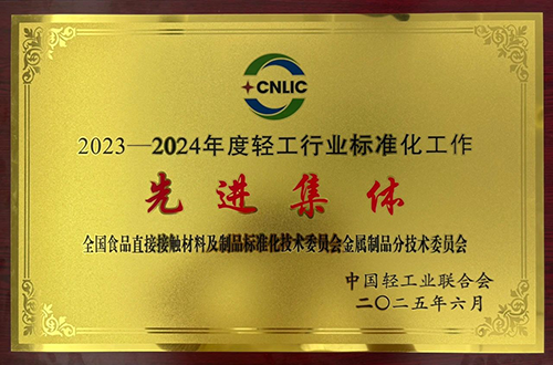 中国食品发酵工业研究院承担秘书处单位的全国食品直接接触材料及制品标准化技术委员会金属制品分技术委员会获得023—2024年度轻工行业标准化工作先进集体”荣誉称号。