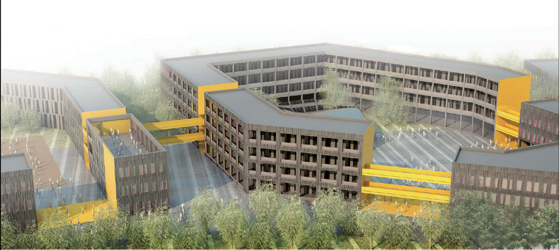 教学楼为局部四层,层高3.9m,建筑高度16.86m。阶梯教室为单层建筑,局部设置夹层,建筑高度为8.150m。餐厅为二层建筑,层高5m,建筑高度为11.050m。体育馆为单层建筑,局部设置夹层,建筑高度为11.015m。立面设计采用GRC挂板、玻璃及木材,力图通过精致的细节设计,创造出精美的品质。