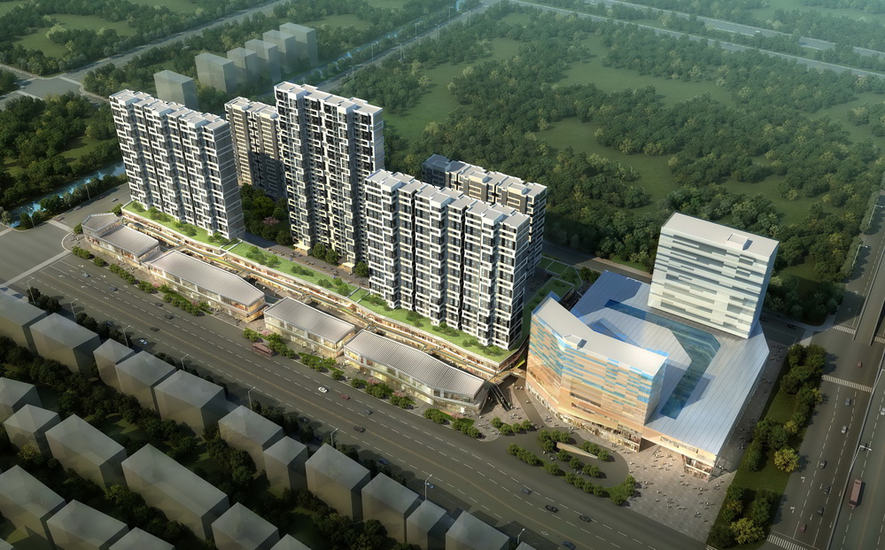 本项目总用地面积为59280平方米(88.9亩),总建筑面积为192820㎡,地上计容建筑面积148200㎡,地下面积44620.建筑密度为40.20%,绿地率20%,容积率为2.5。其中,住宅部分的建筑密度为30%,住宅区绿地率为30%。建筑最高为94.10米。 本项目按照功能分为两部分:住宅区与商业区。地块东南侧为高层住宅区,东北侧为2~3层商业裙房;地块西侧为购物中心,与东北侧商业裙房之间通过连廊联系,形成整体商业氛围。
