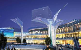 该项目总建筑面积达23万平米,由购物中心、综合商业楼、商业街三大块组成。购物中心建筑面积185613㎡,地上三层为主,局部四层、地下一层;综合商业楼建筑面积29059㎡,地上十三层、地下一层;商业街建筑面积21039㎡,地上二层。地下一层建筑面积达数万平米,通常包括变电所、水泵房、人防工程(平时地库)、冷冻机房、消防控制、生活水泵房、自行车库、仓库、下沉式广场等功能设施。结构形式都为钢筋混凝土框架结构。